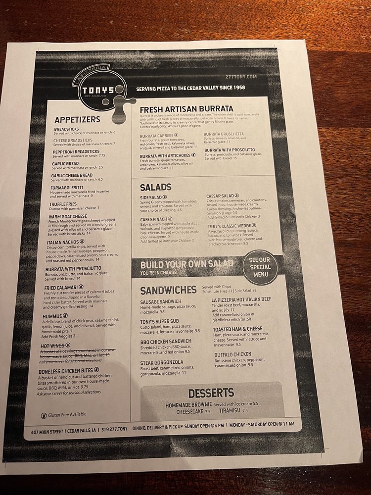 Welcome to Tony's La Pizzeria, a slice of Italian-American delight nestled in the heart of Cedar Falls, Iowa, on Main Street. With a reputation for delicious food and a vibrant atmosphere, Tony's has become a beloved hangout for locals and visitors alike.